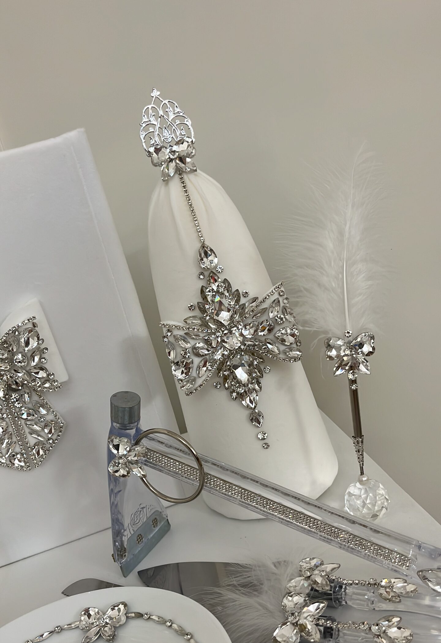 قند بزرگ یکی از اصلیترین عناصر مراسم بلهبرون است که نماد شیرینی و خوشبختی زندگی مشترک به شمار میآید. در این ست، قند بزرگ با تزئین پاپیون برجسته و نگینهای سوارسکی جلوهای لوکس و چشمگیر پیدا کرده است.